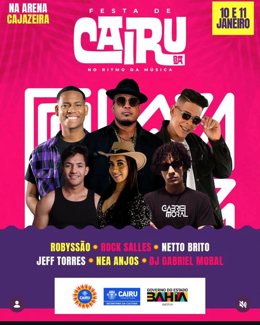 Cairu se prepara para viver dois dias de muita música e celebração, com a festa da cidade em pleno final de semana da culminância do Reinado de São Benedito. Os shows acontecerão no próximo sábado (10) e domingo (11), a partir das 20 horas, na Arena Cajazeira. O evento integra o calendário festivo do município e promete reunir moradores, filhos, amigos e visitantes num grande momento de confraternização.