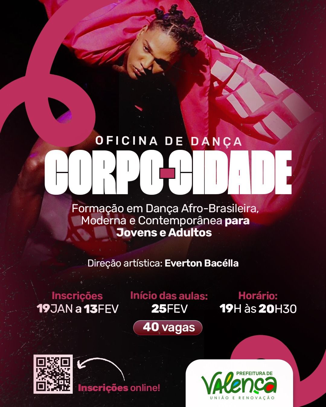 A Prefeitura de Valença, através da Secretaria de Cultura, abre inscrições para a oficina de dança Corpo- Cidade, um espaço de experimentação, escuta e movimento, onde o corpo se relaciona com o ambiente urbano e suas possibilidades.