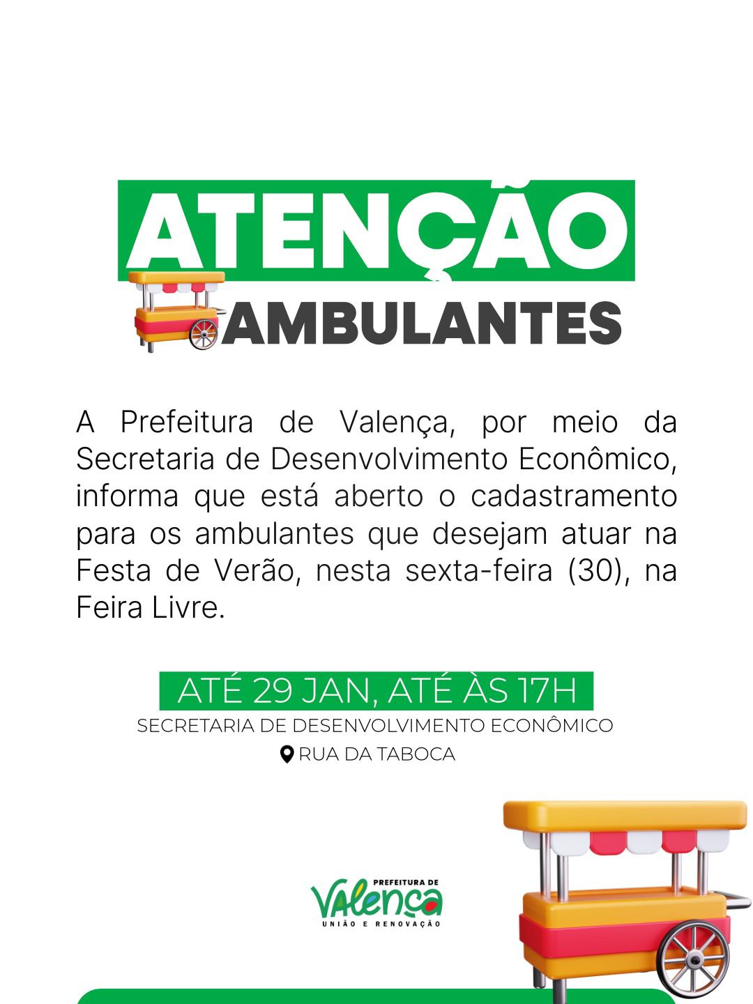 A Prefeitura de Valença, por meio da Secretaria de Desenvolvimento Econômico, informa que está aberto o cadastramento para os ambulantes que desejam atuar na Festa de Verão, nesta sexta-feira (30), na Feira Livre.