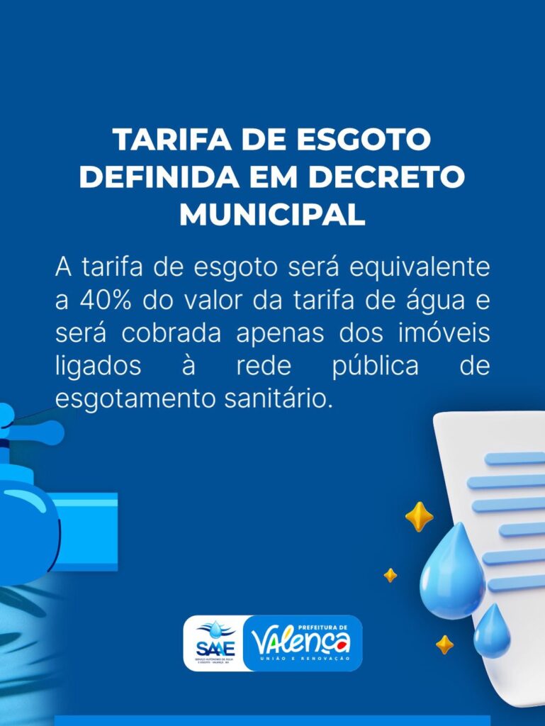 A Prefeitura de Valença deu um passo importante para ampliar o saneamento básico e melhorar a qualidade de vida da população ao regulamentar a Tarifa de Serviços de Esgotamento Sanitário (TSES), por meio do Decreto nº 6.168/2026. A medida organiza a cobrança, assegura benefícios sociais e cria regras mais claras para o funcionamento do serviço, garantindo mais transparência e equilíbrio para os usuários do SAAE.