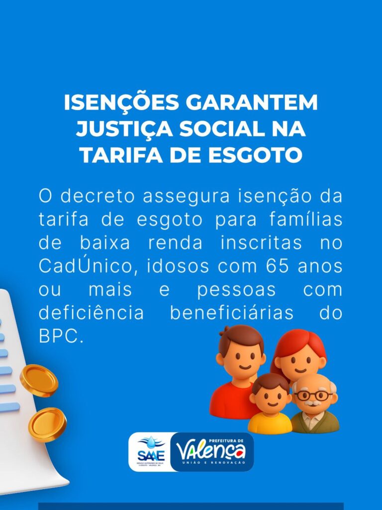 O decreto também estabelece isenções sociais importantes, garantindo que famílias de baixa renda inscritas no Cadastro Único (CadÚnico), idosos com 65 anos ou mais e pessoas com deficiência beneficiárias do BPC fiquem isentas da tarifa de esgoto. Órgãos públicos municipais e imóveis utilizados pela administração também não serão tarifados, reforçando o caráter social e a modicidade da cobrança.