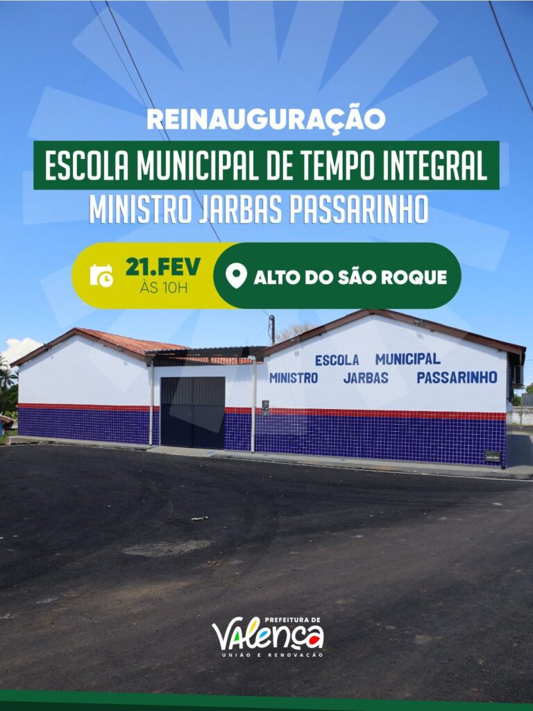 No sábado (21), a partir das 10h, a comunidade celebra a reinauguração da Escola Municipal de Tempo Integral Ministro Jarbas Passarinho, no bairro Alto do São Roque. O espaço foi requalificado para oferecer mais conforto, estrutura e qualidade no ensino.