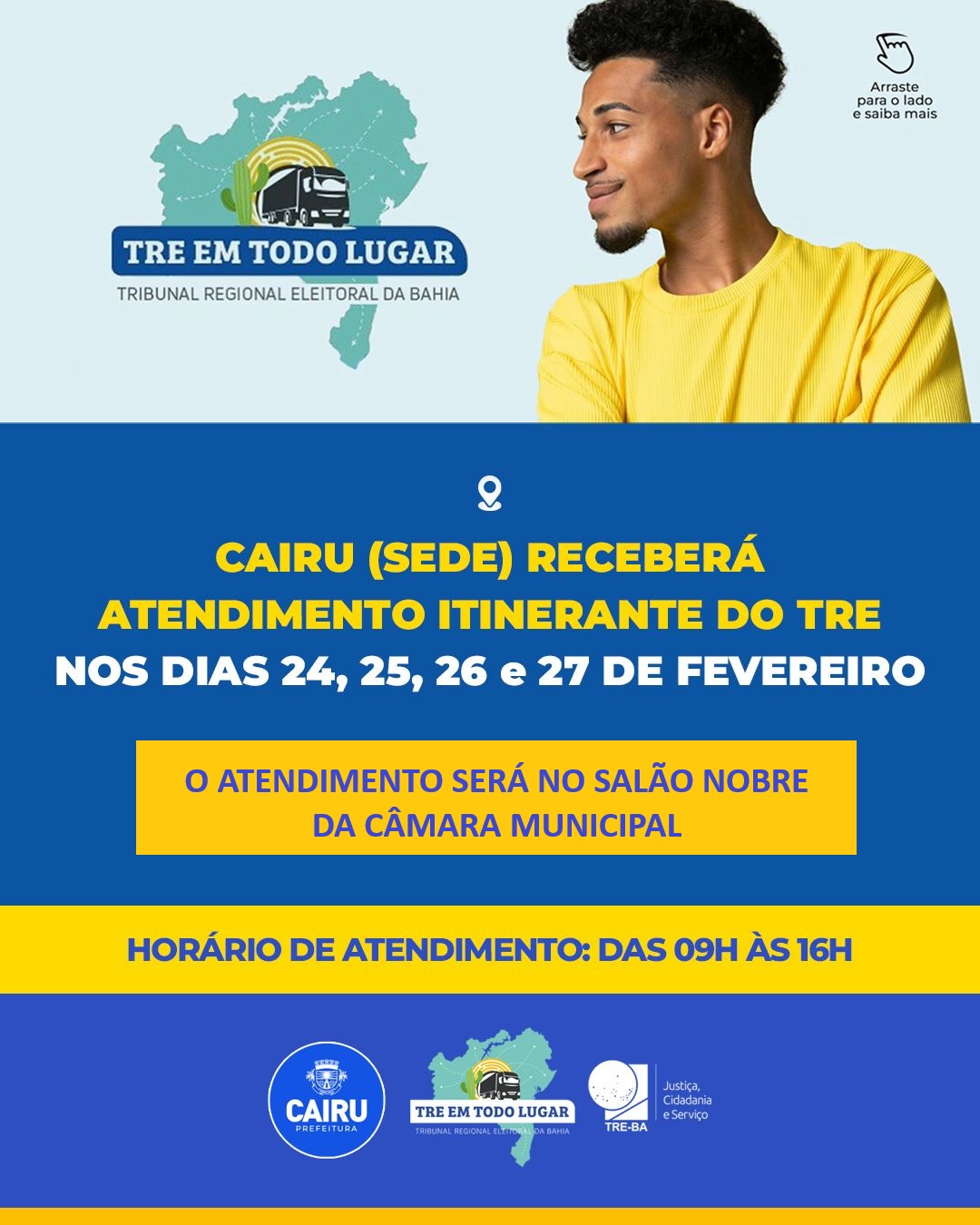 O projeto “TRE em Todo Lugar”, do Tribunal Regional Eleitoral da Bahia, atenderá na sede de Cairu desta terça (24) até sexta-feira (27), no Salão Nobre da Câmara Municipal.