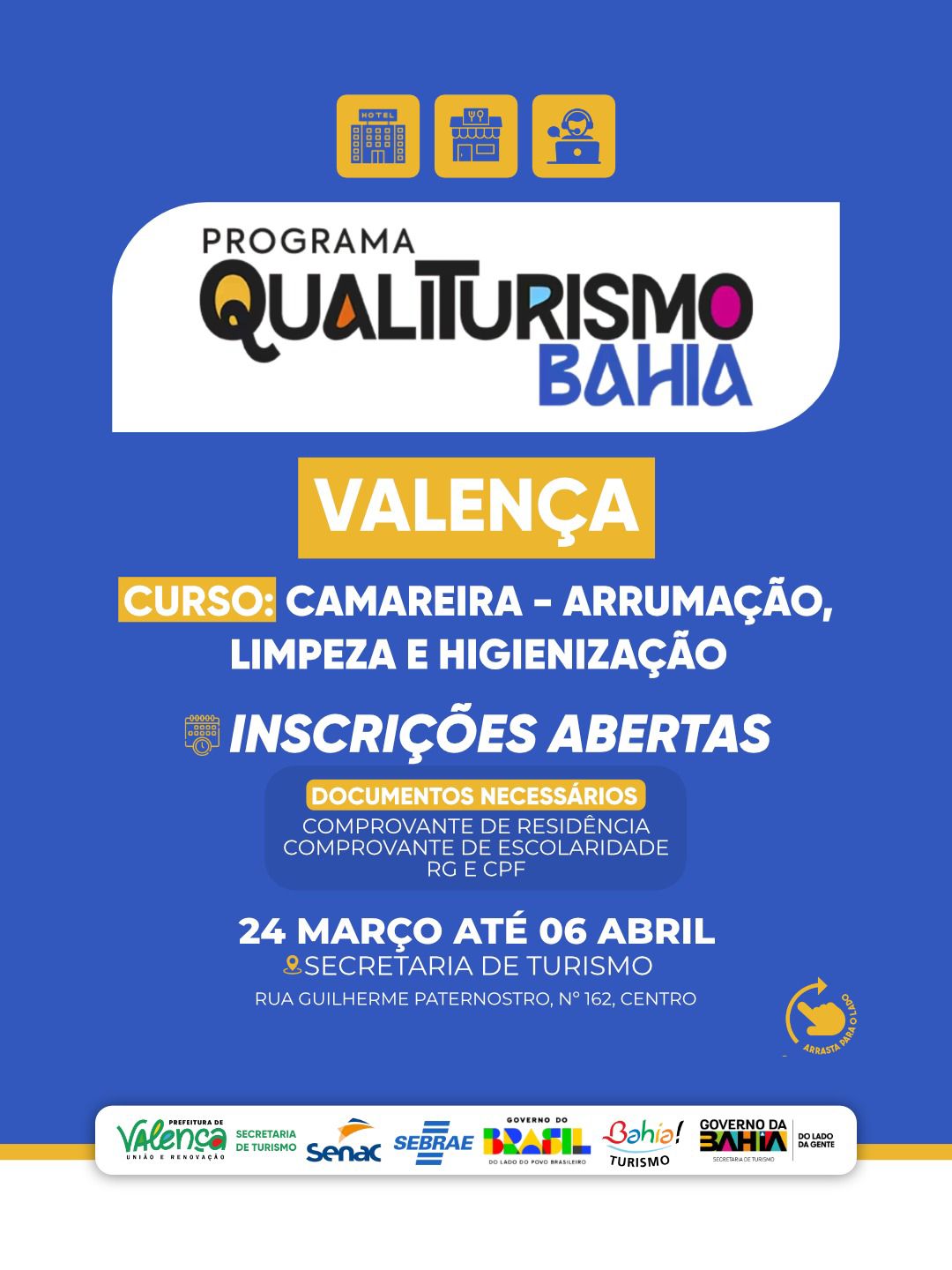 Com foco na valorização do turismo e na geração de oportunidades, a Prefeitura de Valença, por meio da Secretaria de Turismo, está com inscrições abertas para o curso de Camareira: Arrumação, limpeza e higienização, uma iniciativa que integra o Programa Qualiturismo Bahia. A ação busca fortalecer e qualificar o setor turístico local, preparando profissionais para atuar com excelência na rede de hospedagem do município.