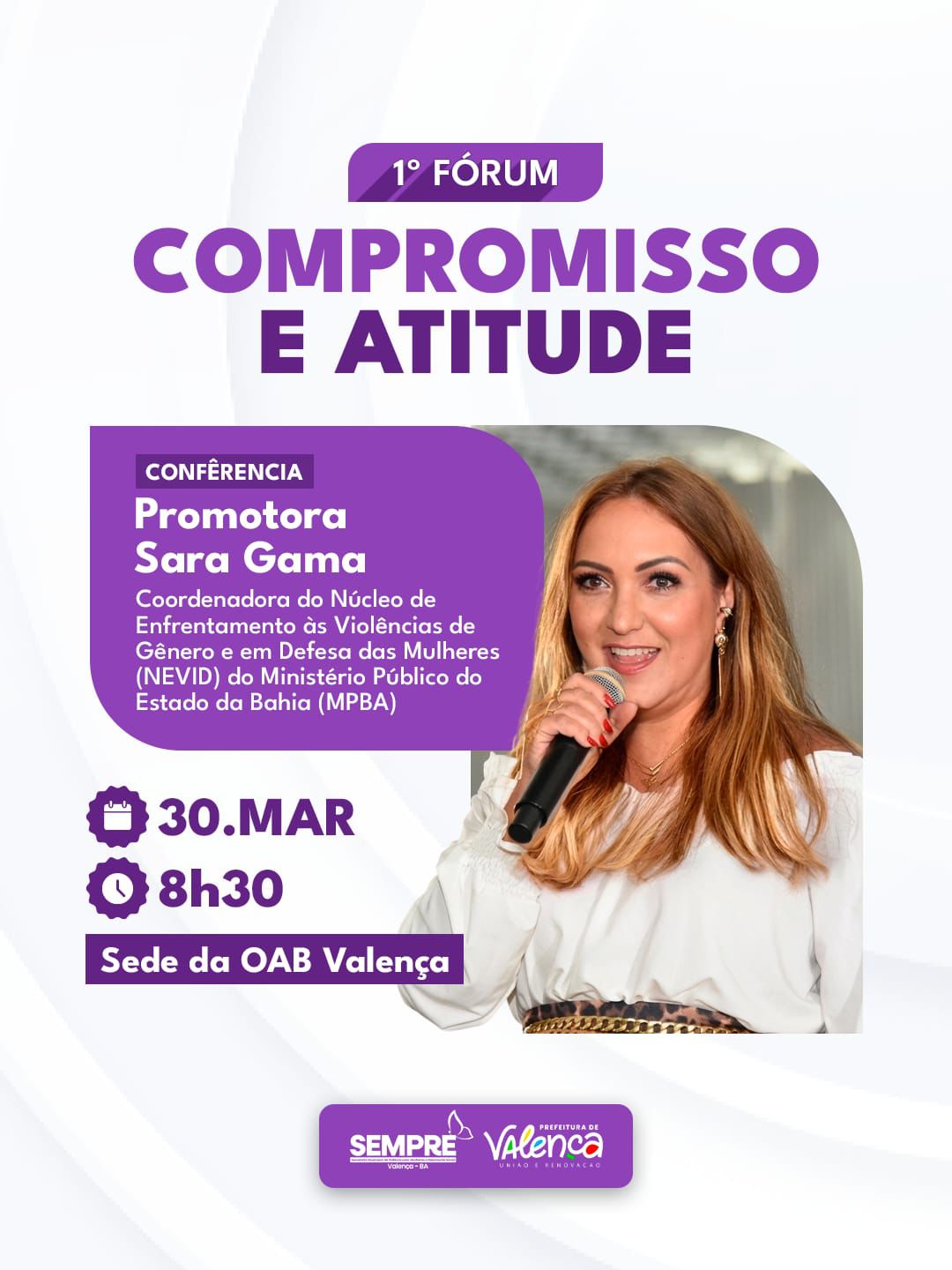A Prefeitura de Valença, através da Secretaria de Políticas para as Mulheres e Reparação (SEMPRE), realiza o 1° Fórum Compromisso e Atitude com a conferência “Mulheres Vivas, Livres e Protegidas” da promotora Sara Gama na segunda-feira, dia 30 de março, na sede da Ordem dos Advogados (OAB) de Valença no Novo Horizonte, às 08:30h.
