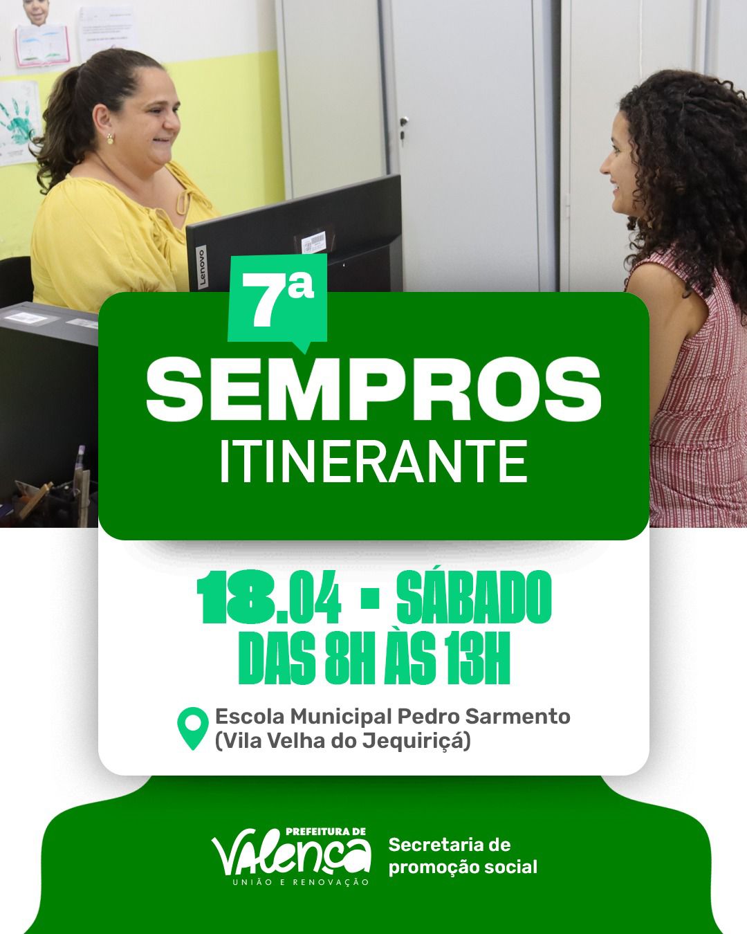 Sábado, 18 de abril, das 8h às 13h, a SEMPROS Itinerante estará na Escola Municipal Pedro Sarmento, em Vila Velha do Jequiriçá, com diversos serviços gratuitos para a população.