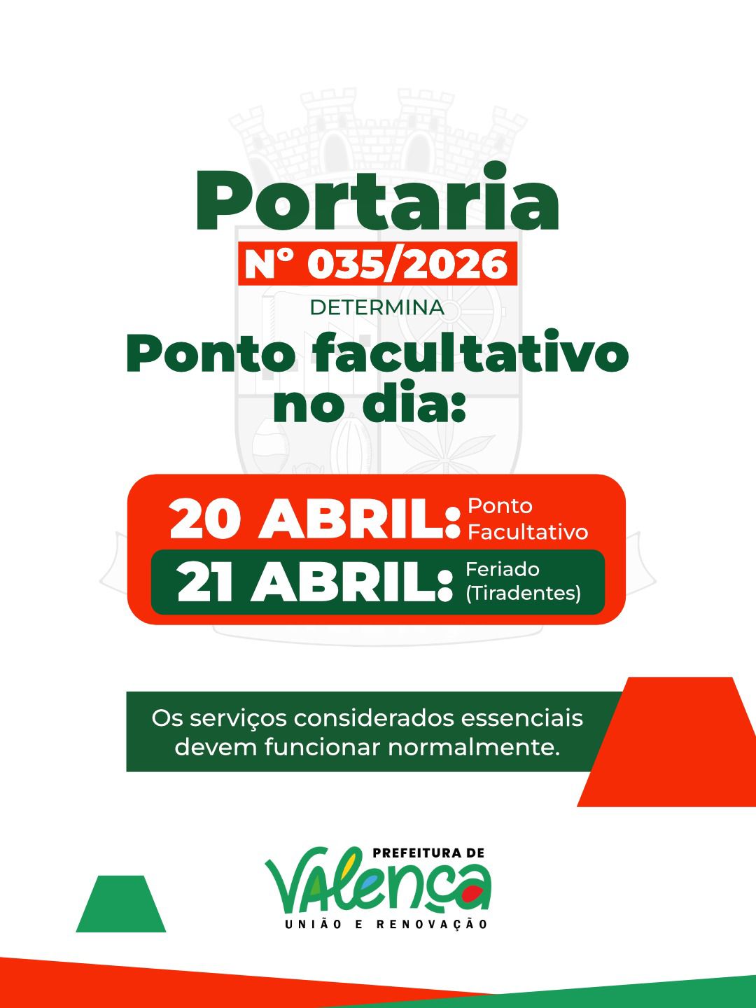 Ressaltamos que os serviços considerados essenciais deverão funcionar normalmente, assegurando a continuidade do atendimento à população.