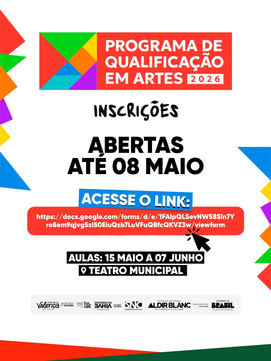 As aulas acontecem entre os dias 15 de maio e 07 de junho, no Theatro Municipal de Valença. A inscrição é simples, rápida e deve ser feita exclusivamente online, por meio do link abaixo: